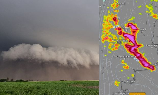 Comenzando por Cuyo, La Pampa, sur de Córdoba y de Buenos Aires desplazándose hacia el noreste con ráfagas fuertes y ocasional caída de granizo. Se prevén lluvias de 15 a 50 mm pudiendo superarse especialmente en Entre Ríos.