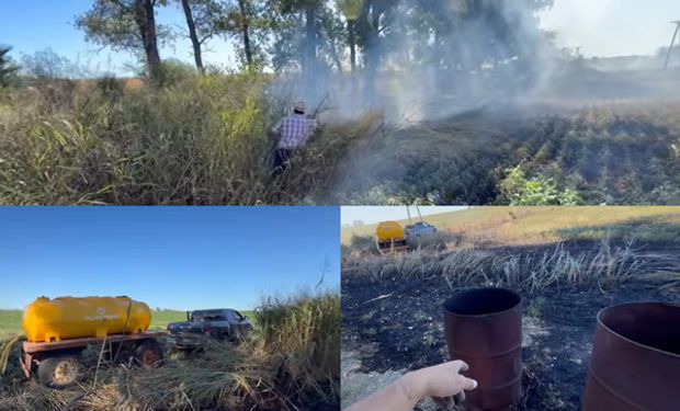 “Nos llaman que se originó un incendio en un campo donde sembramos. Ni lo dudamos y fuimos con nuestro aguatero a apagarlo”, relató en el video, donde se observa la magnitud del foco de incendio avanzando sobre rastrojo de trigo y cultivo implantado.